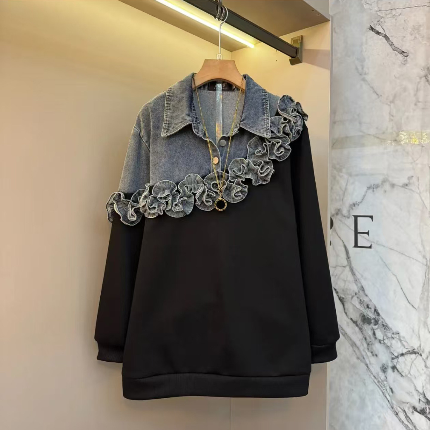 胖妹妹冬季牛仔拼接假两件韩版上衣时尚宽松遮肉遮肚打底大衫洋气