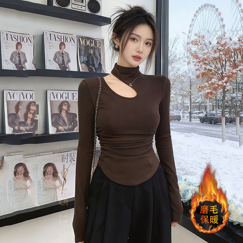 大码女装花边设计感弹力德绒内搭打底衫胖妹妹秋冬季新款加绒上衣
