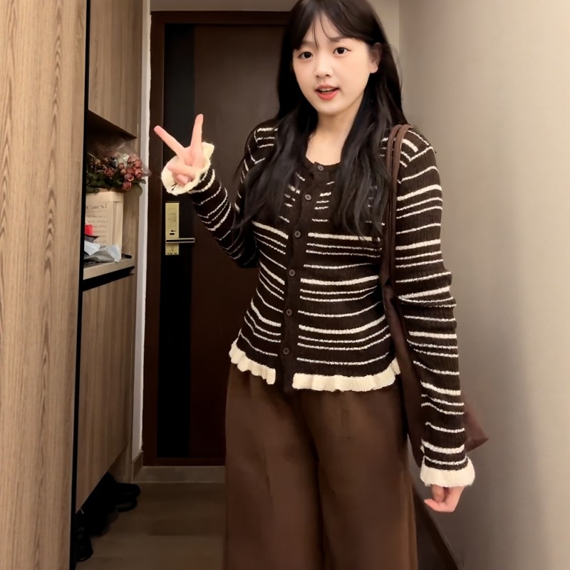 大码女装木耳边长袖条纹针织衫冬季胖妹妹显瘦绝美内搭打底小上衣