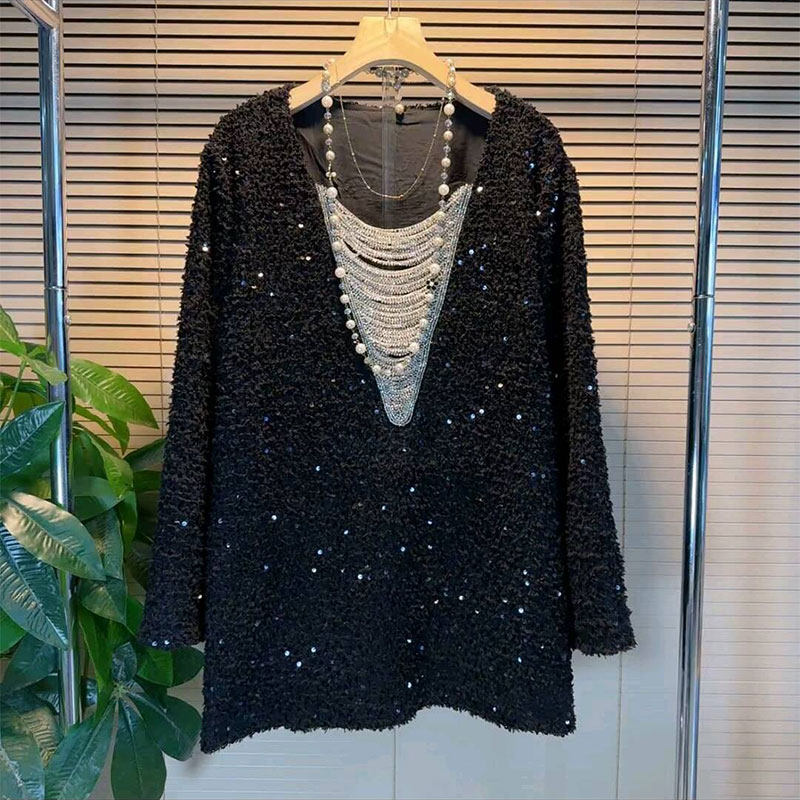 胖妹妹大码女装冬季新款时尚韩版毛绒亮片串珠打底衫名媛范上衣女