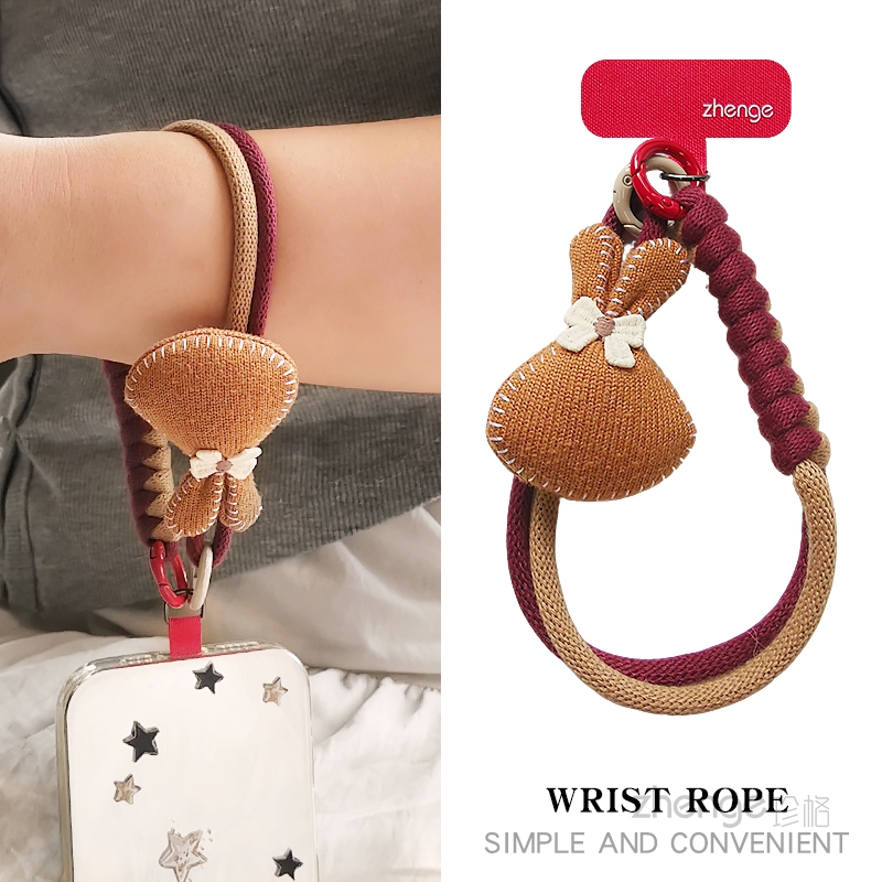 手机挂绳短款撞色编织粗腕带可爱毛绒小兔挂件户外运动吊绳壳结实