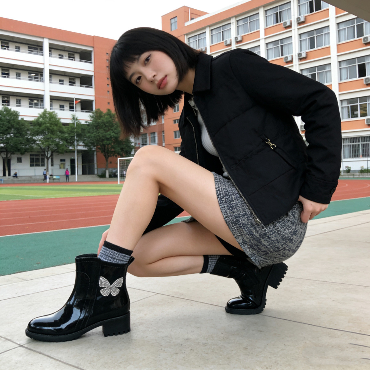新品水钻蝴蝶结中筒雨鞋女防滑防水时尚学生雨靴卡通低帮马丁靴女