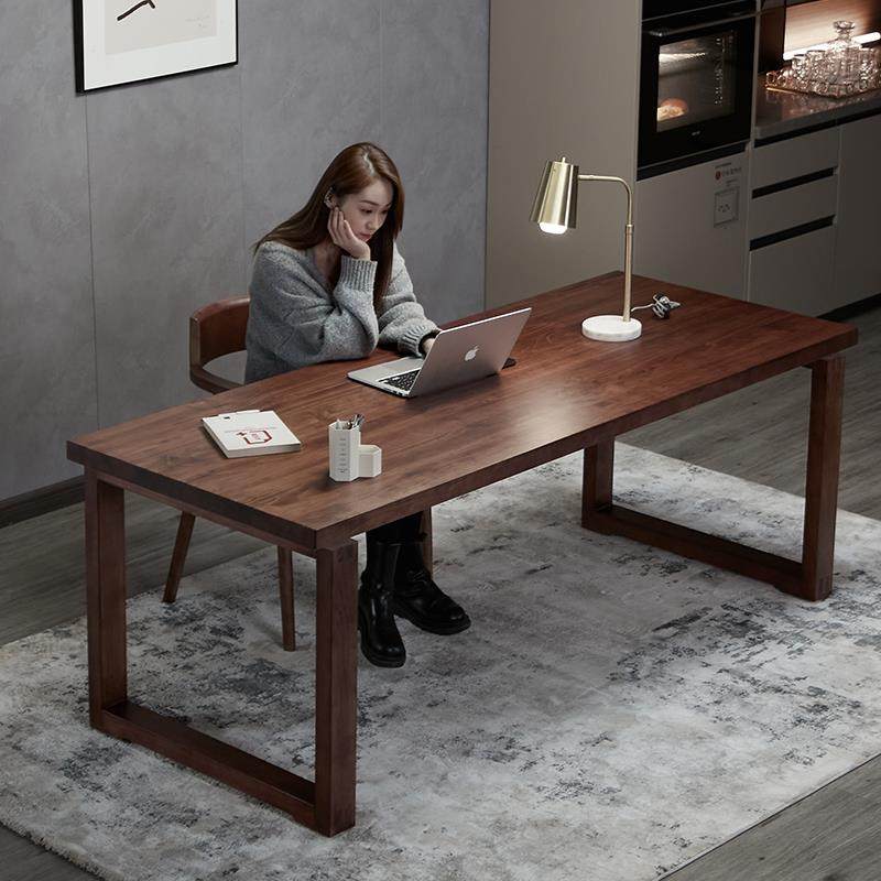 实木双人电脑桌台式家用简约现代办公桌北欧卧室书桌黑胡桃木桌子