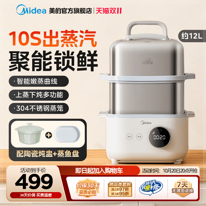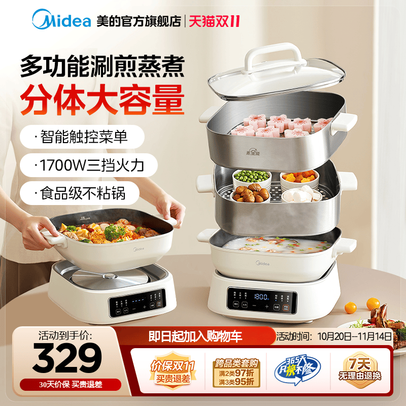 美的新款电蒸锅家用三层不锈钢电锅大容量可预约多功能蒸煮一体锅
