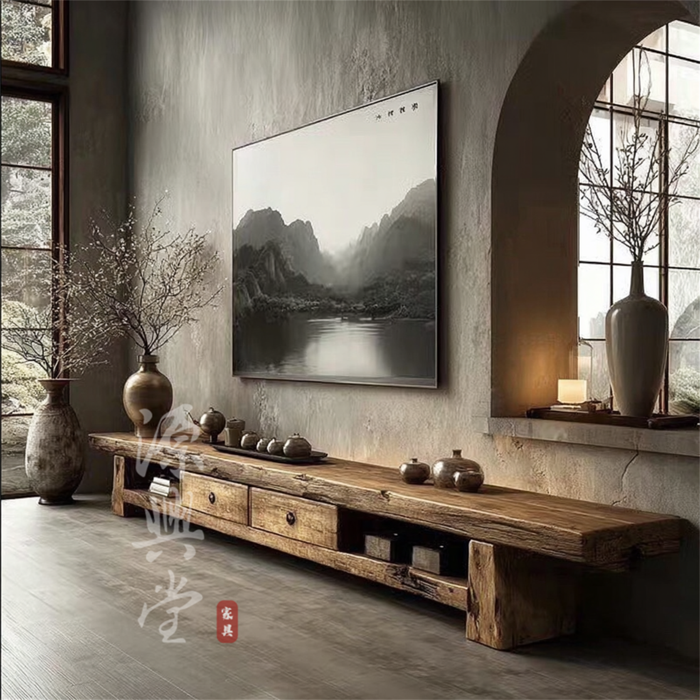 侘寂风定制电视柜实木古木落地矮柜中古家具客厅复古电视柜源兴堂