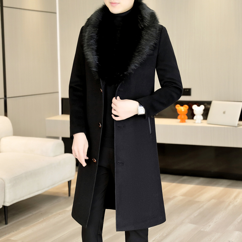 秋冬季男士加长款过膝毛呢大衣外套潮流商务男装加厚毛领呢子风衣