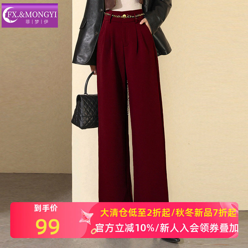 菲梦伊红色西装裤女冬季复古高腰直筒显瘦宽松阔腿裤职业休闲长裤