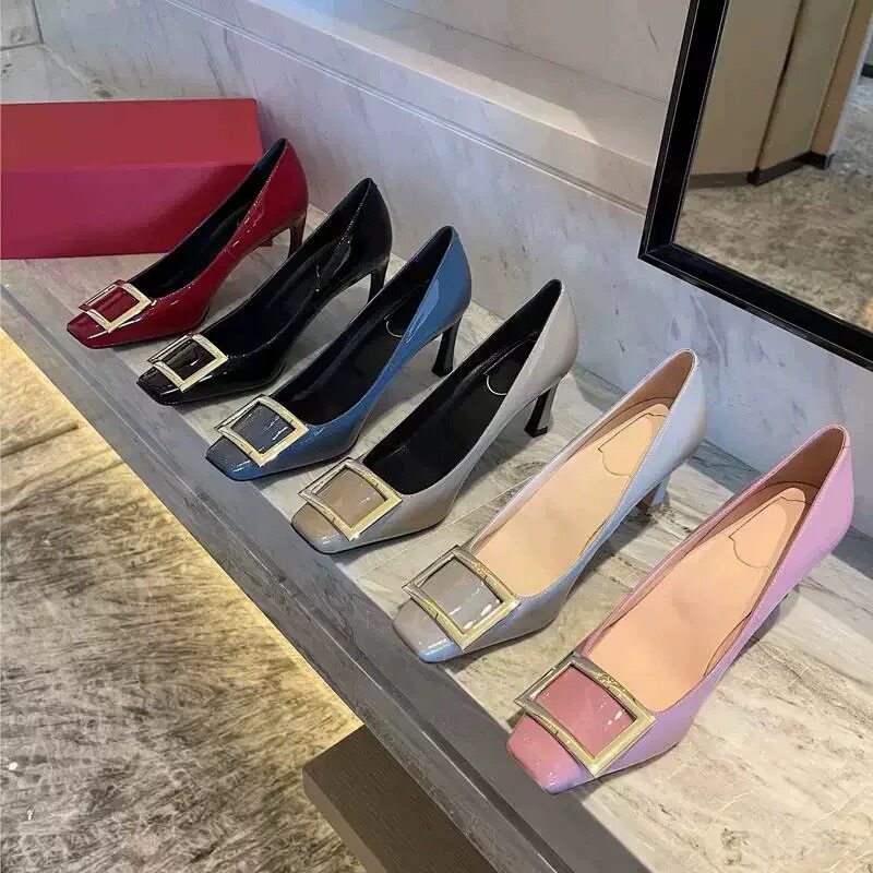 方扣高跟鞋女2025年香蕉跟方头漆皮紫色超高跟鞋细跟婚鞋性感单鞋