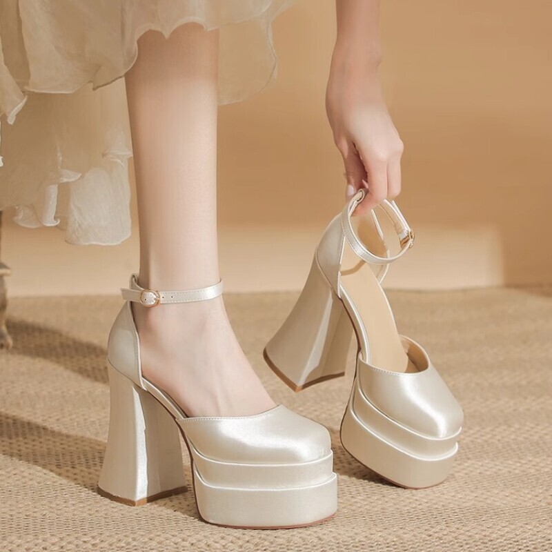 15CM恨天高跟鞋粗跟防水台红色婚鞋2026春季新款法式包头中空单鞋