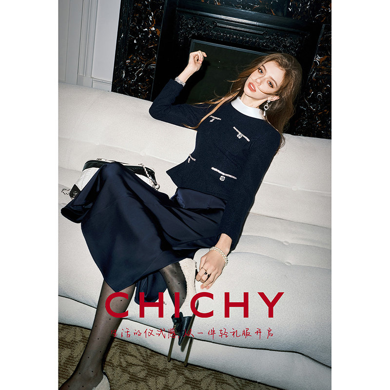 CHICHY法式名媛小香风假两件长袖连衣裙女26春季新款高级修身长裙