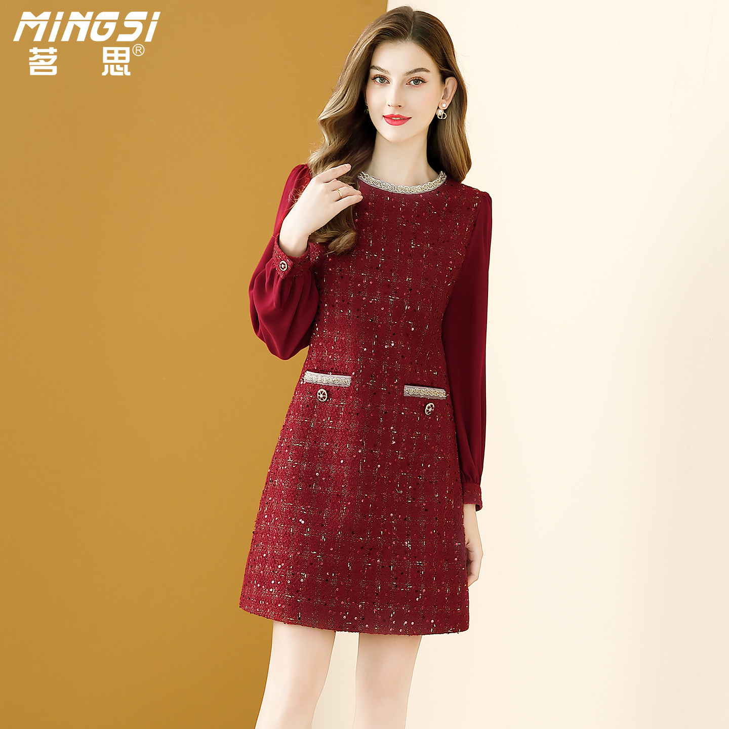 茗思名媛粗花呢红色连衣裙女2026春季新款亮片气质显瘦小香风裙子