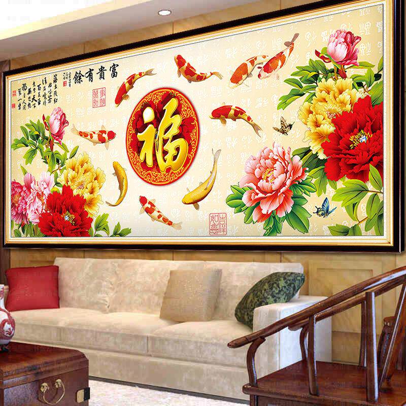 5d钻石画满钻新款2023年客厅花开富贵砖石贴钻画十字绣九鱼图2022