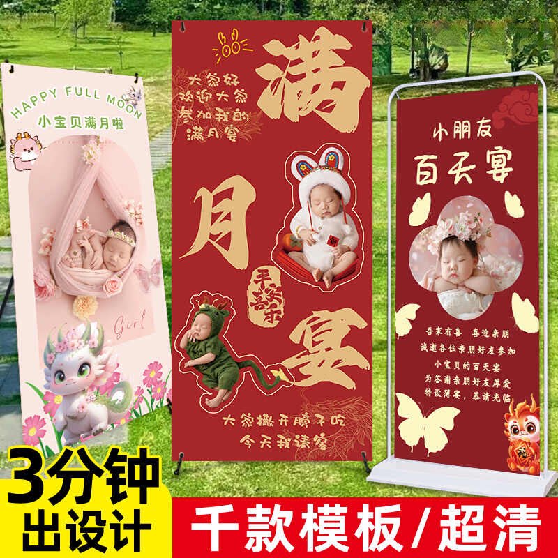 生日海报定制宝宝百日满月宴迎宾海报儿童照片展架易拉宝设计制作