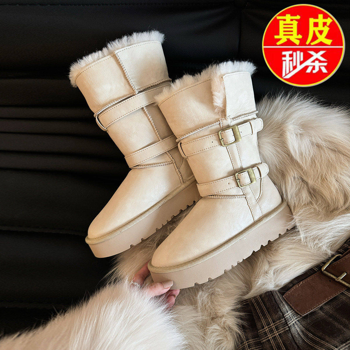 F21牛皮厚底羊毛雪地靴女2025新款冬季保暖真皮东北防水防滑棉鞋