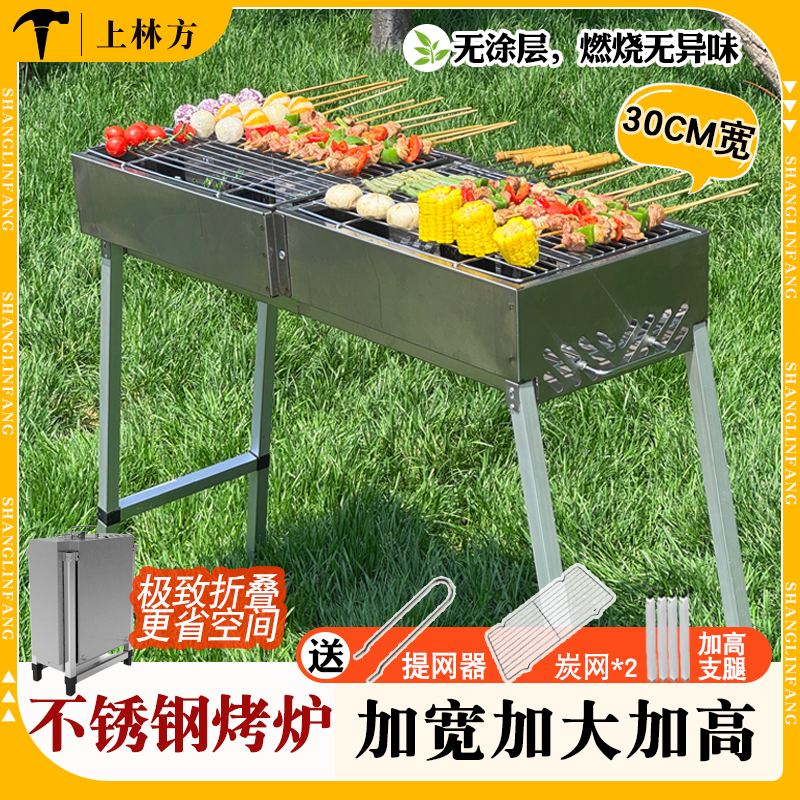 上林方不锈钢烧烤炉子家用户外商用便携露营新款折叠烧烤架烤肉炉