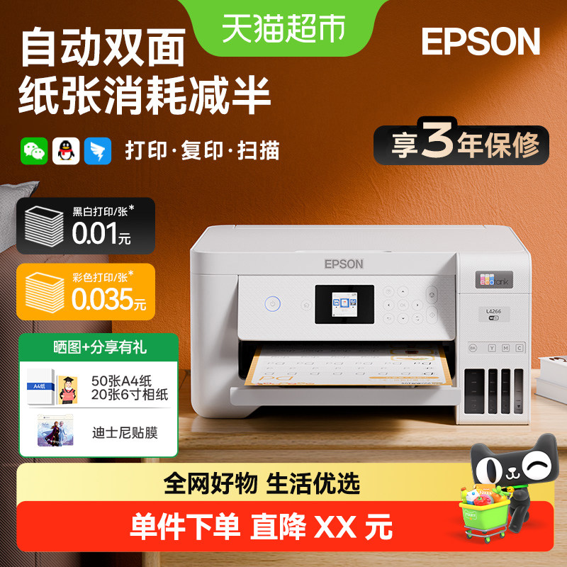 【政府补贴】爱普生墨仓式打印机自动双面家用小型L4266/4268/4263彩色打印复印一体机官方办公手机无线A4
