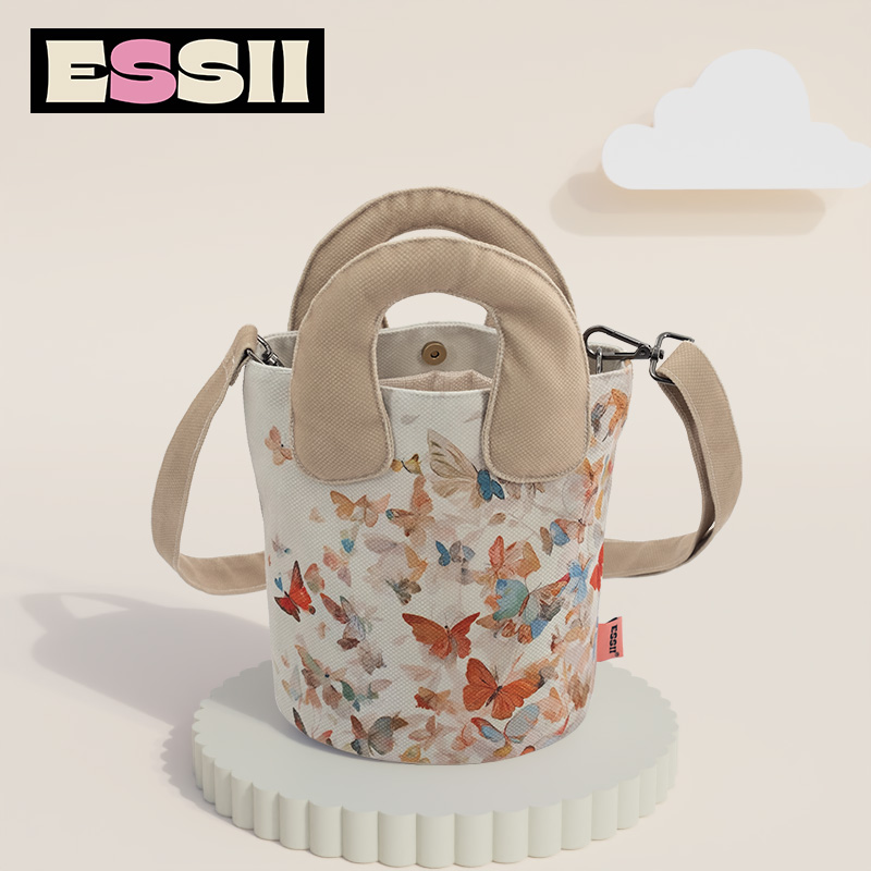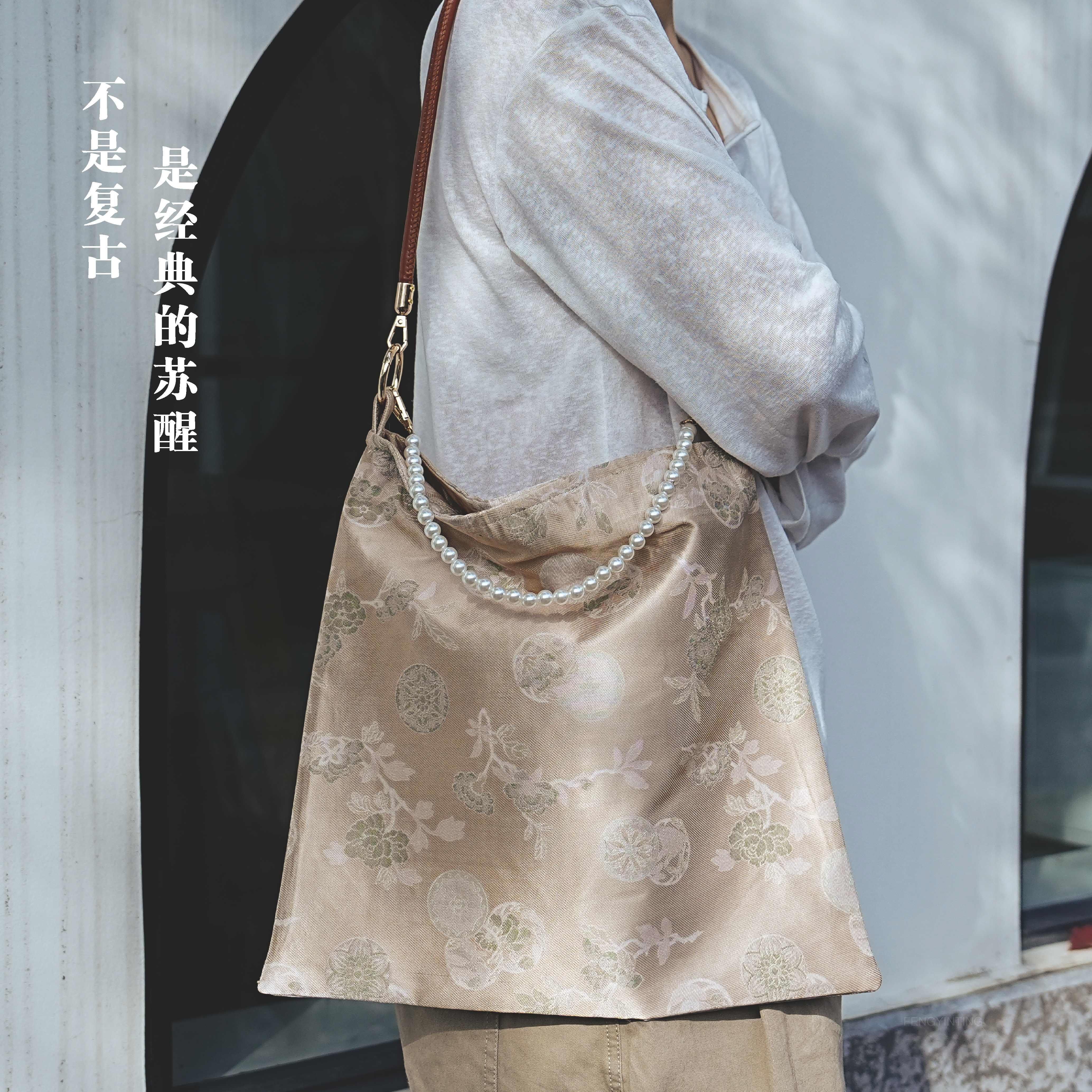 完美款款国潮艺术水墨蝴蝶花朵文艺少女百搭单肩包布包马蹄水桶包