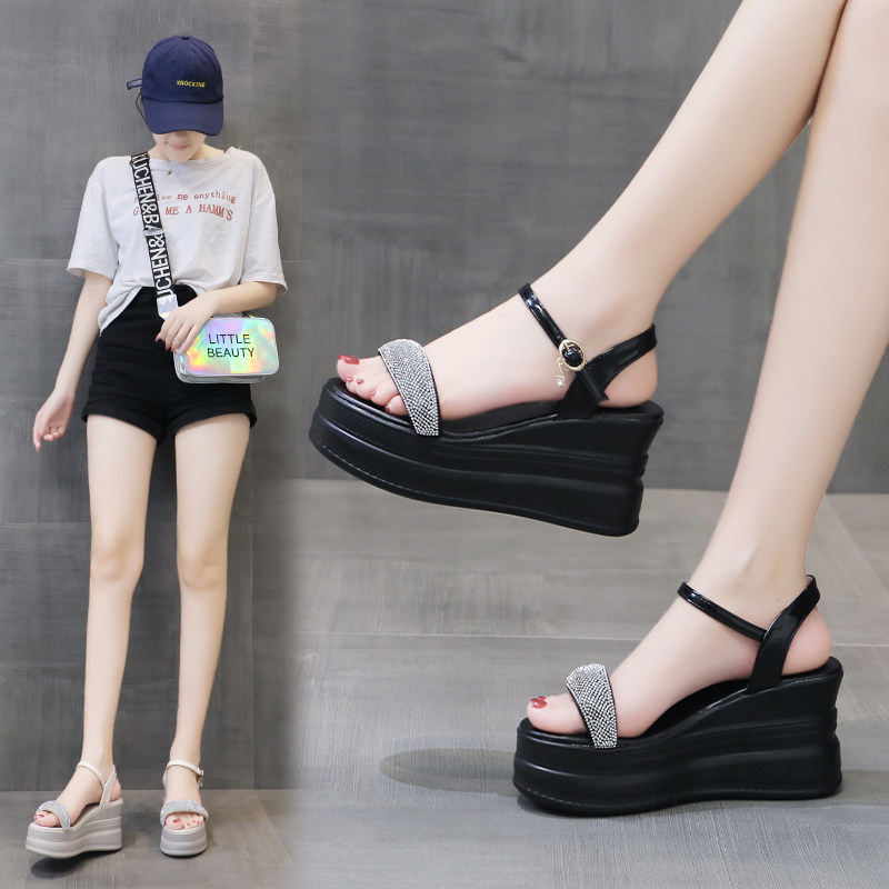 夏季新款小个子9CM高跟坡跟女凉鞋厚底水钻防水台一字带高跟婚鞋