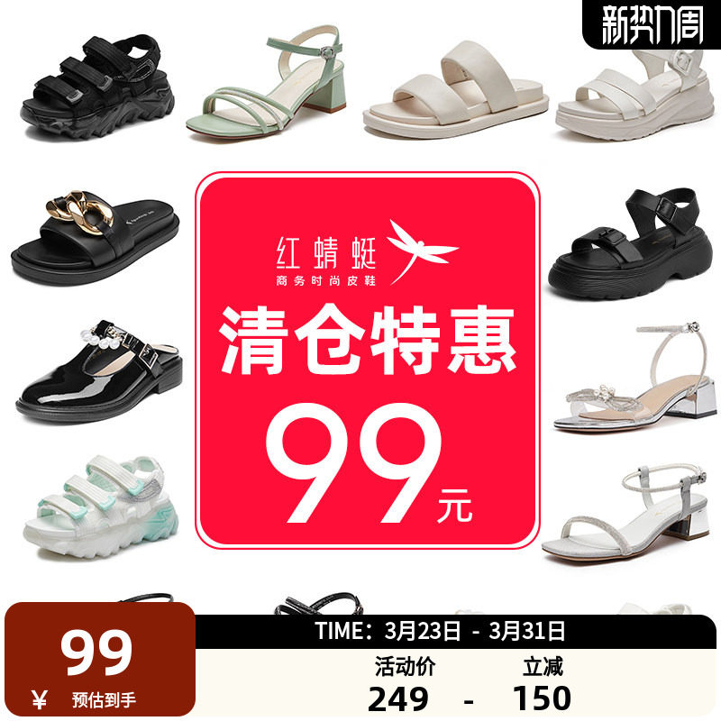 【断码清仓】红蜻蜓女鞋百搭坡跟女凉鞋真皮软底妈妈一字式扣带鞋