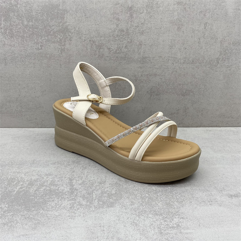 2025夏款断码处理真皮女鞋厚底一字扣带水钻亮片仙女风坡跟女凉鞋