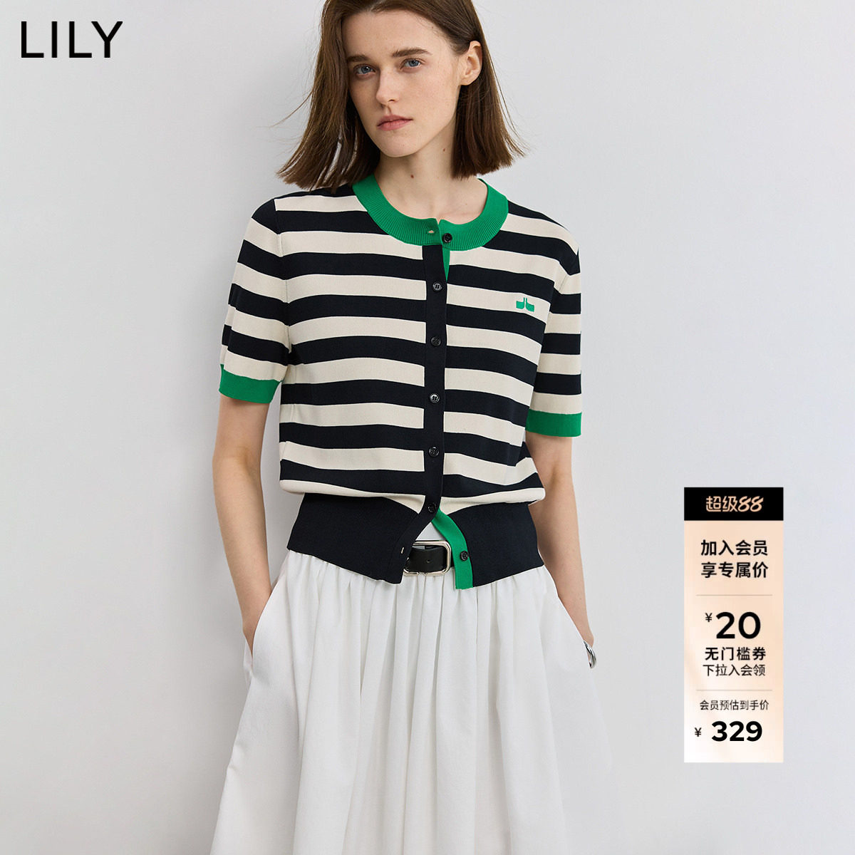 LILY2026夏新款女装设计感复古黑白撞色条纹圆领短袖针织开衫外套