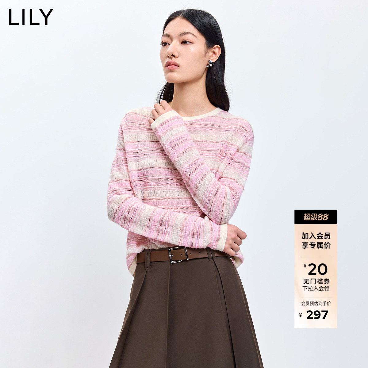 LILY2026春新款女装含羊毛马海毛撞色条纹浅色圆领长袖针织衫毛衣