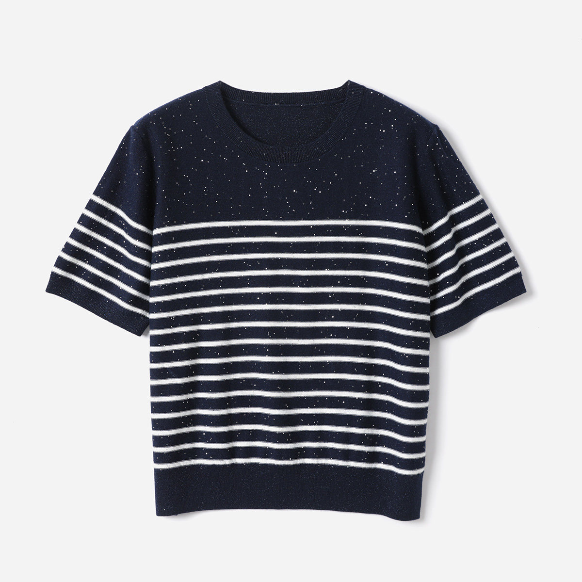 WZT09145 茉莉雅集 法式温柔圆领条纹混纺亮闪珠片短袖针织套衫