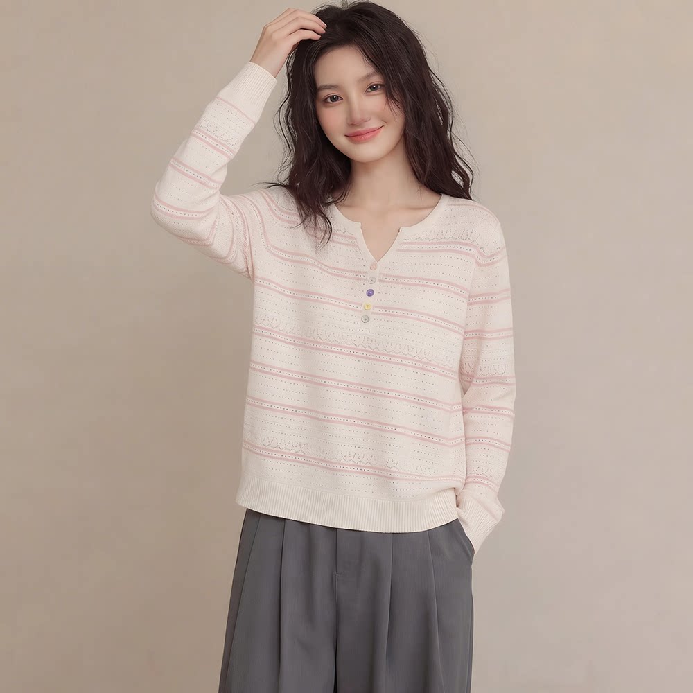 Even Vintage | 低饱和樱花粉 粉色条纹小V领微透宽松针织衫