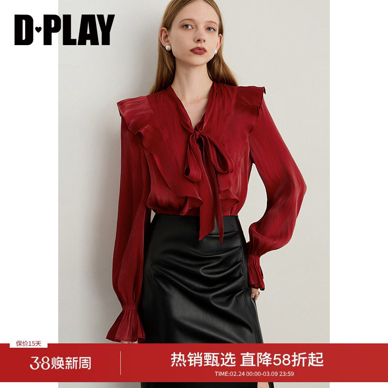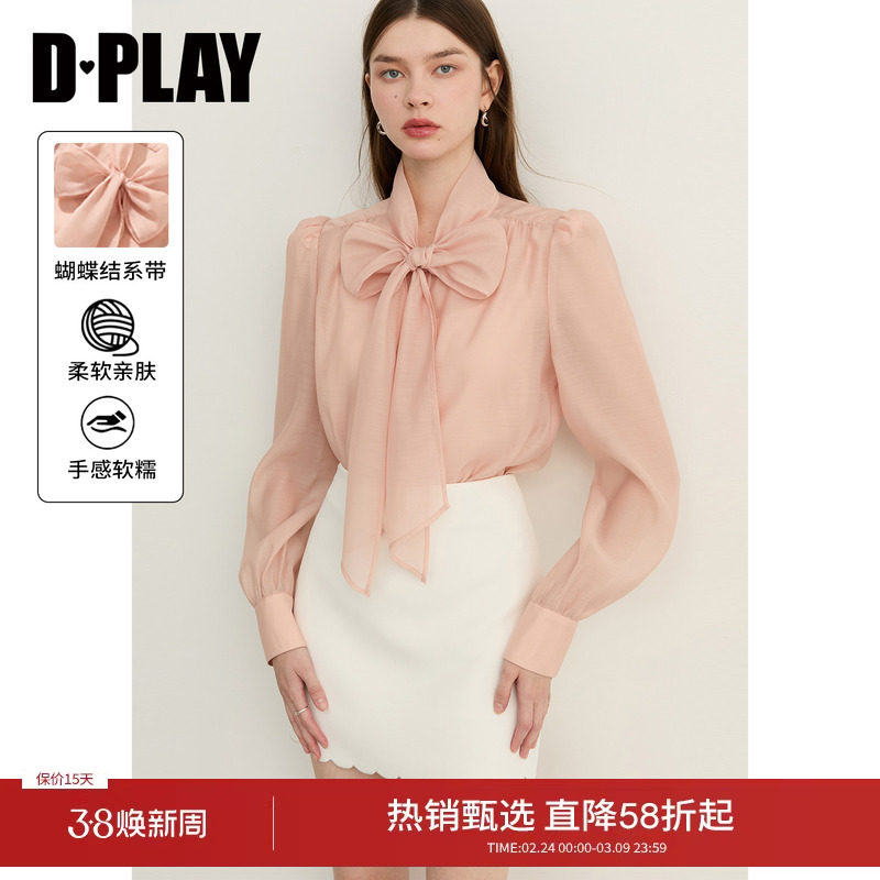 DPLAY2026年春季新款粉色衬衫女蝴蝶结系带法式甜美气质小衫