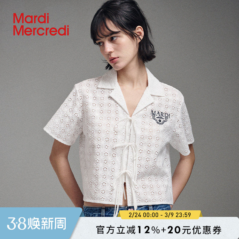 MardiMercredi徽章绣花蝴蝶结系带镂空短袖衬衫上衣女航海水手领