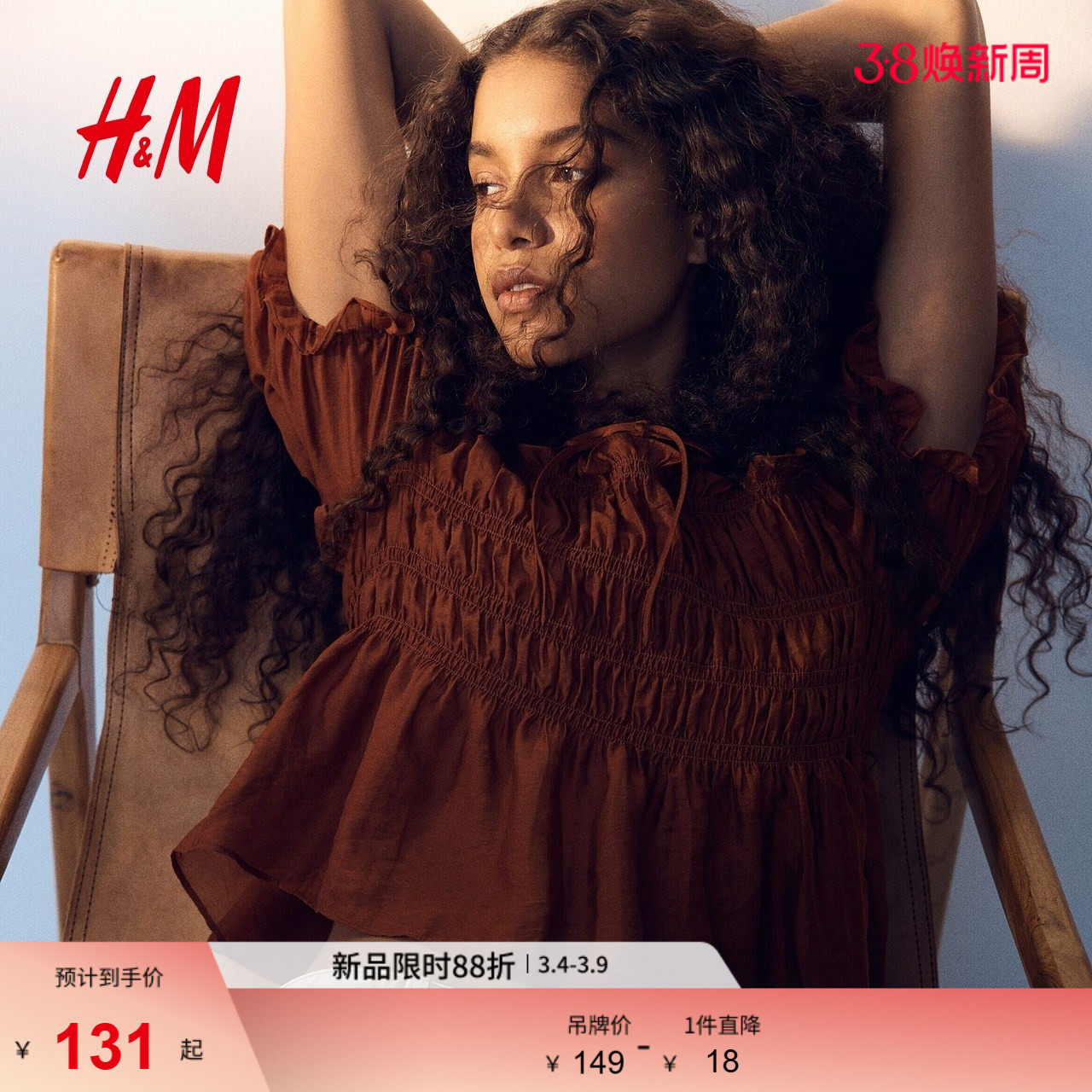 HM女装衬衫2026春季新款圆领蝴蝶结系带抽褶缩褶衬衣上衣1316657