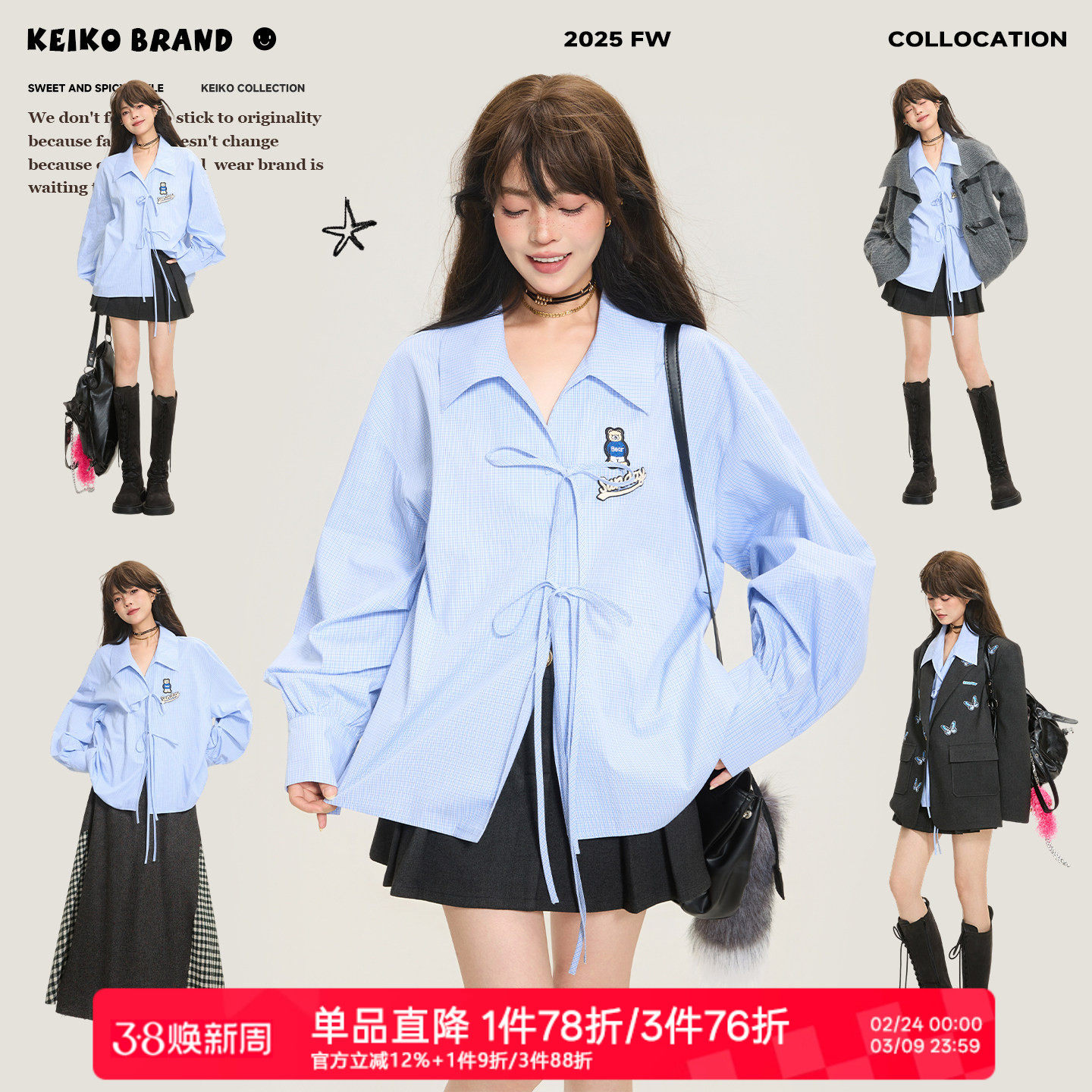 KEIKO 韩系蓝色格纹长袖衬衫女26春季蝴蝶结系带挺括休闲chic上衣