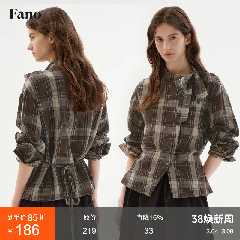 范洛Fano 100棉格纹衬衫女2026春异形扣蝴蝶结系带设计感小众上衣