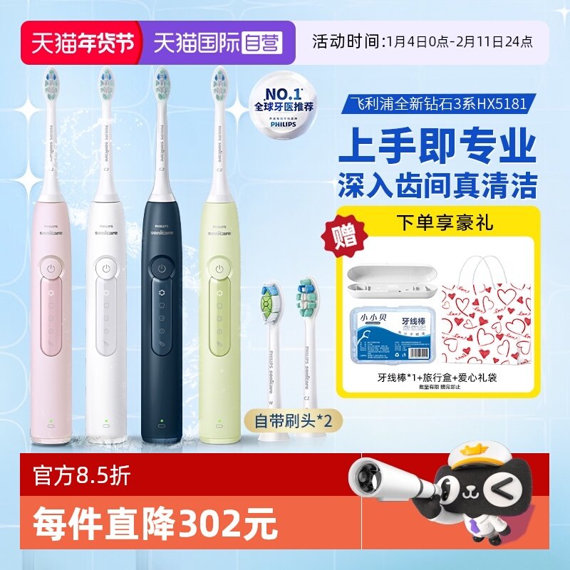 【自营】飞利浦电动牙刷HX5181男女情侣款钻石3系HX6730升级款