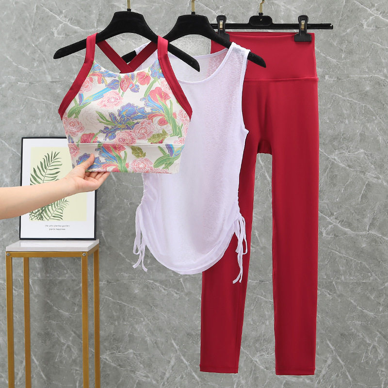 新款瑜伽服套装中国红三件套莫代尔纯棉修身舞蹈服健身运动性感女