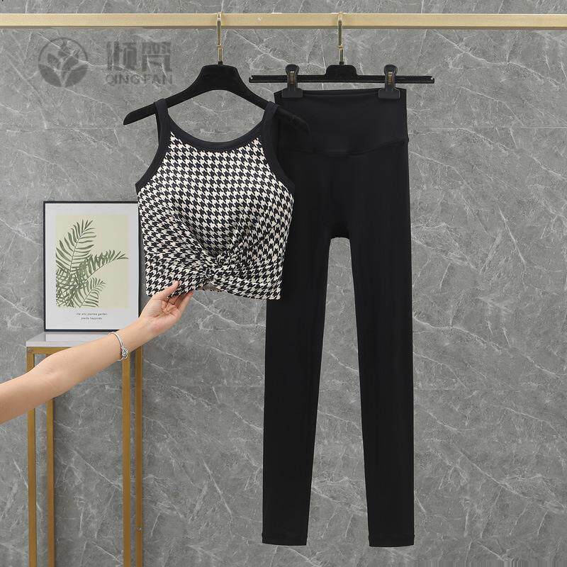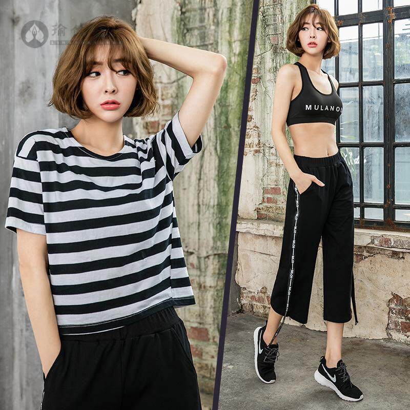 新款条纹潮版瑜伽服套装女时尚户外韩版阔腿裤运动健身服三件套女