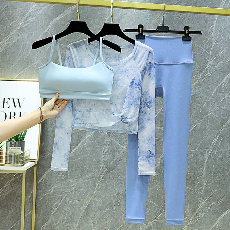 瑜伽服套装网红甜美健身三件套网纱外搭高腰收腹九分裤运动长袖女