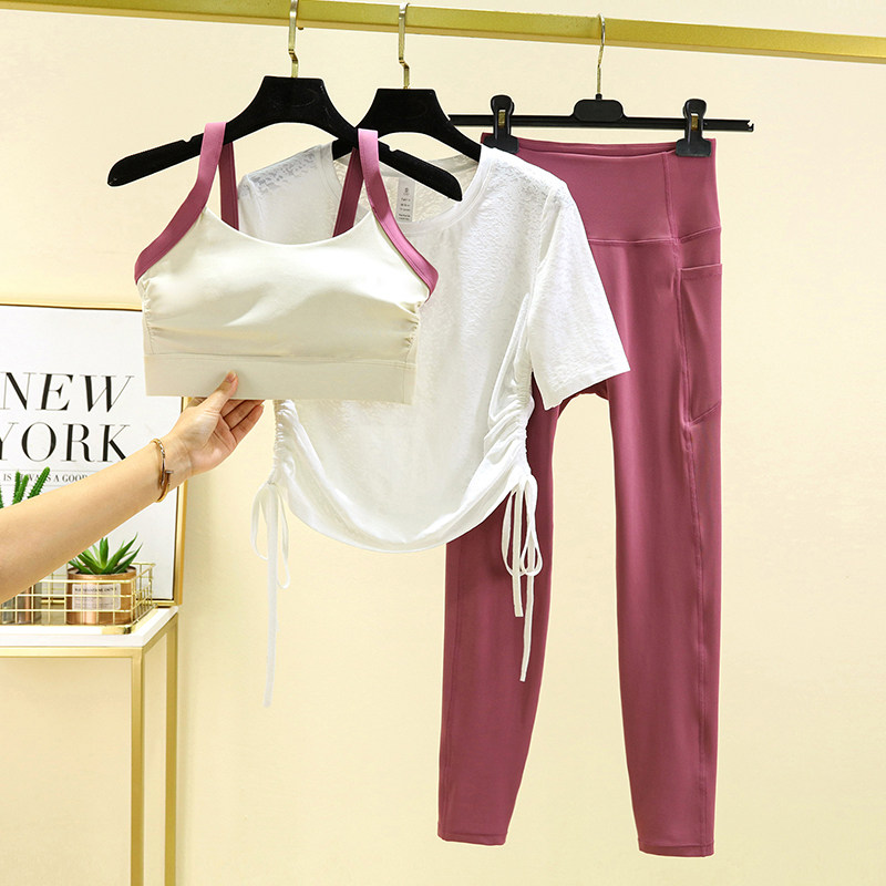 瑜伽服拼色三件套女春带胸垫瑜伽运动跑步速干衣束腰显瘦健身套装