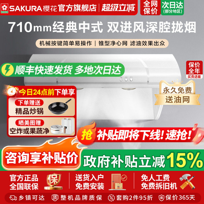 樱花吸抽油烟机家用厨房强力抽风机侧吸吸油烟大吸力官网方旗舰店