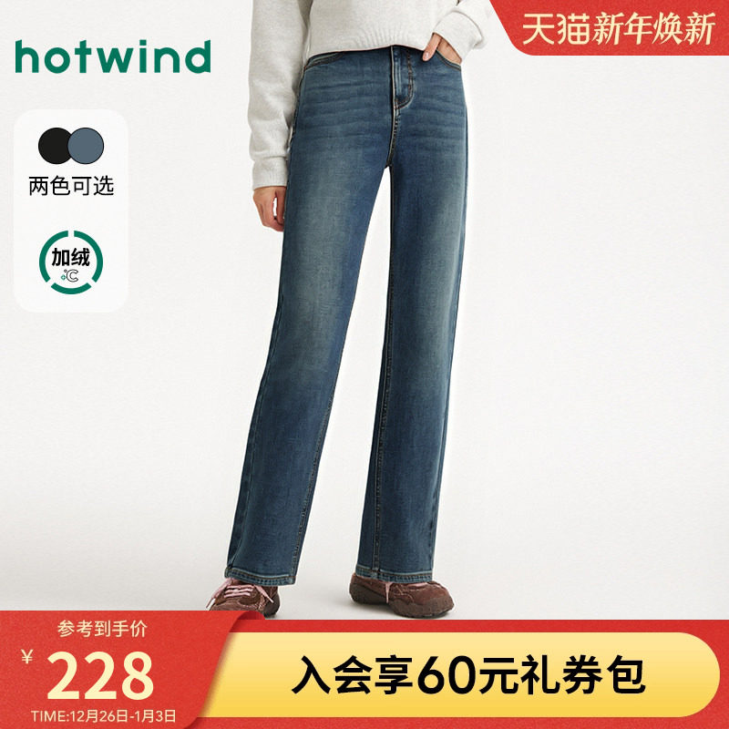 热风女士加绒牛仔裤2025年冬季新款时尚宽松水洗加绒直筒牛仔裤