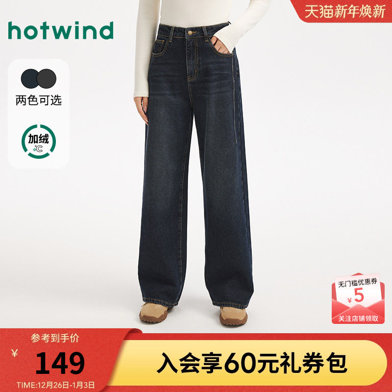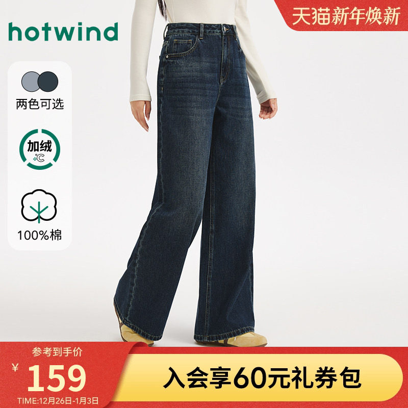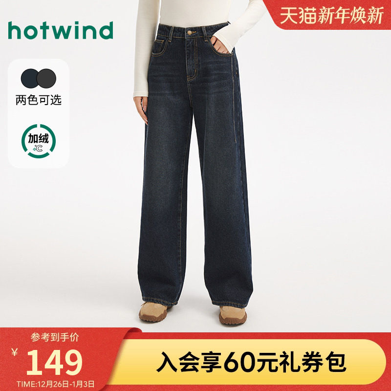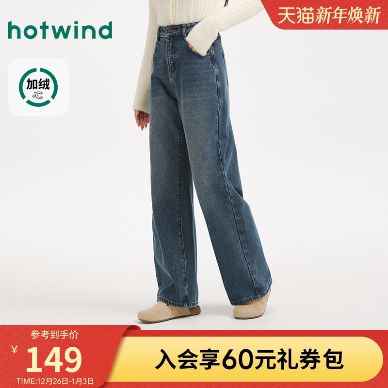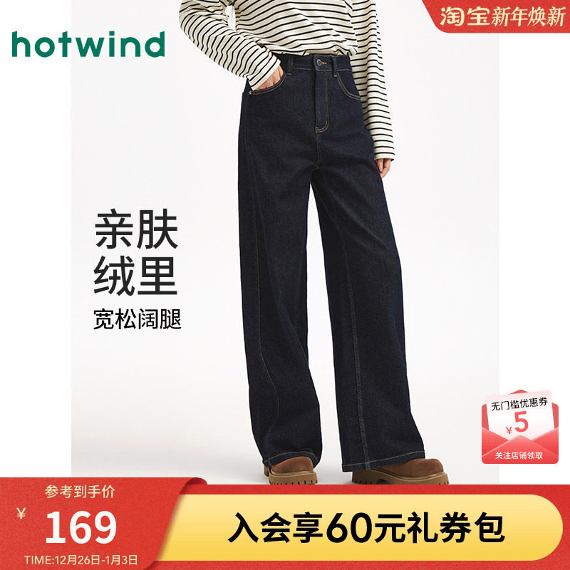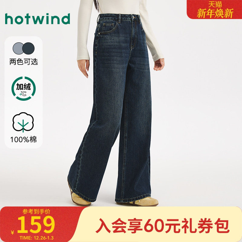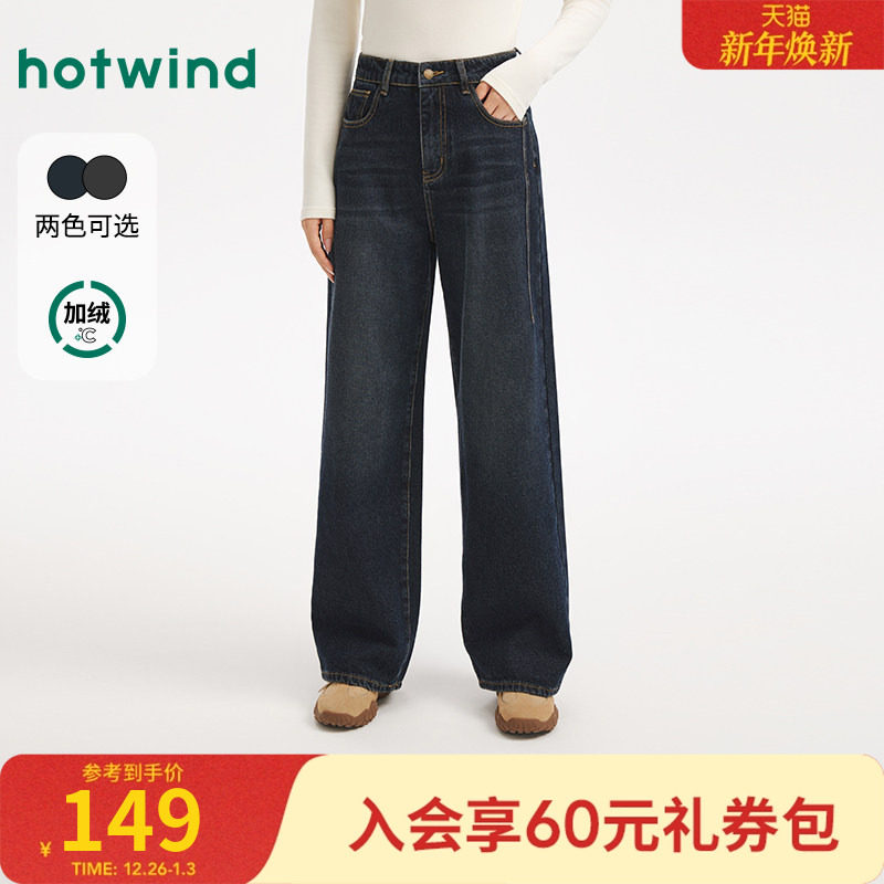 热风女士加绒牛仔裤2025年冬季新款宽松深色水洗加绒阔腿牛仔裤