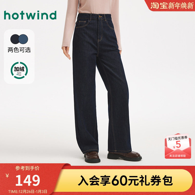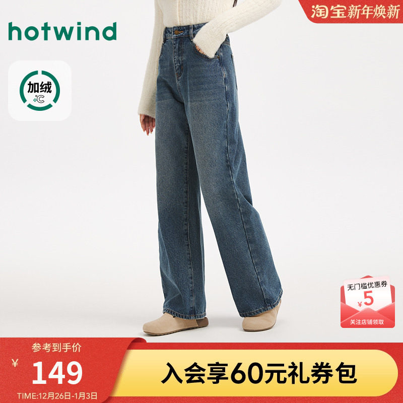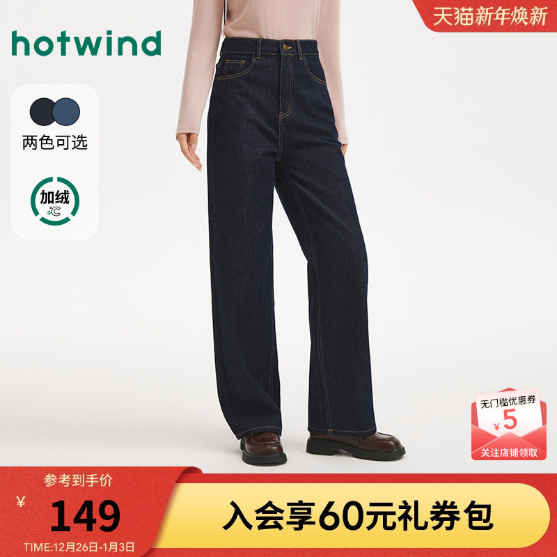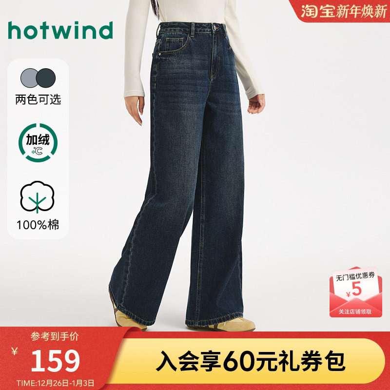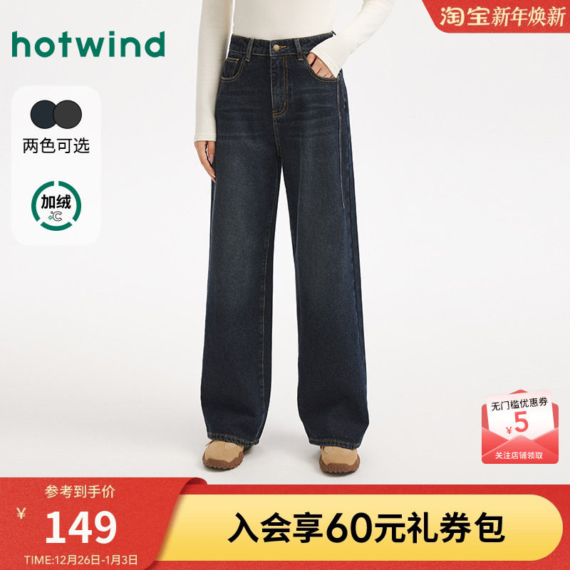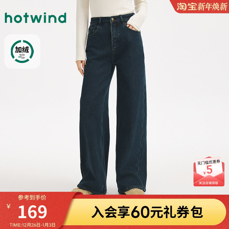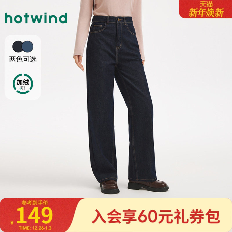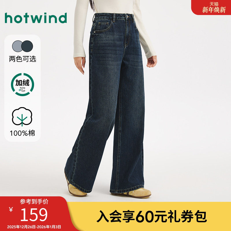 热风女士加绒牛仔裤2025年冬季新款宽松深色水洗加绒阔腿牛仔裤