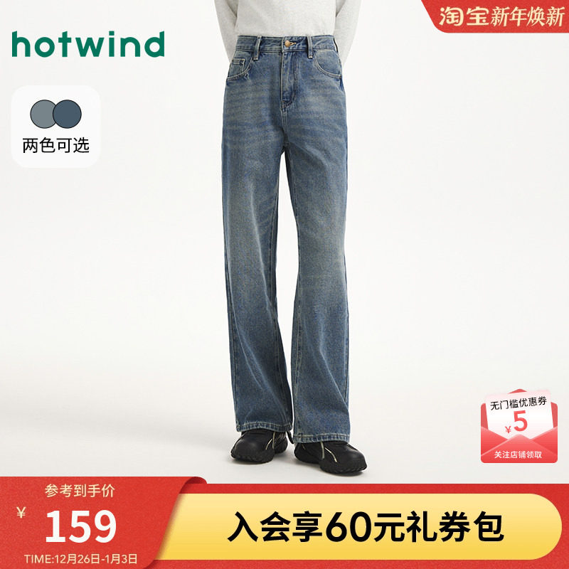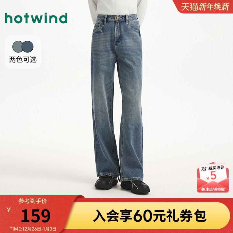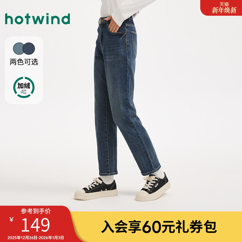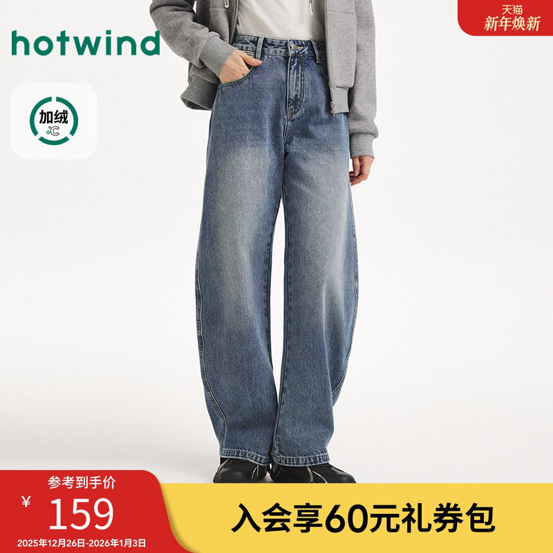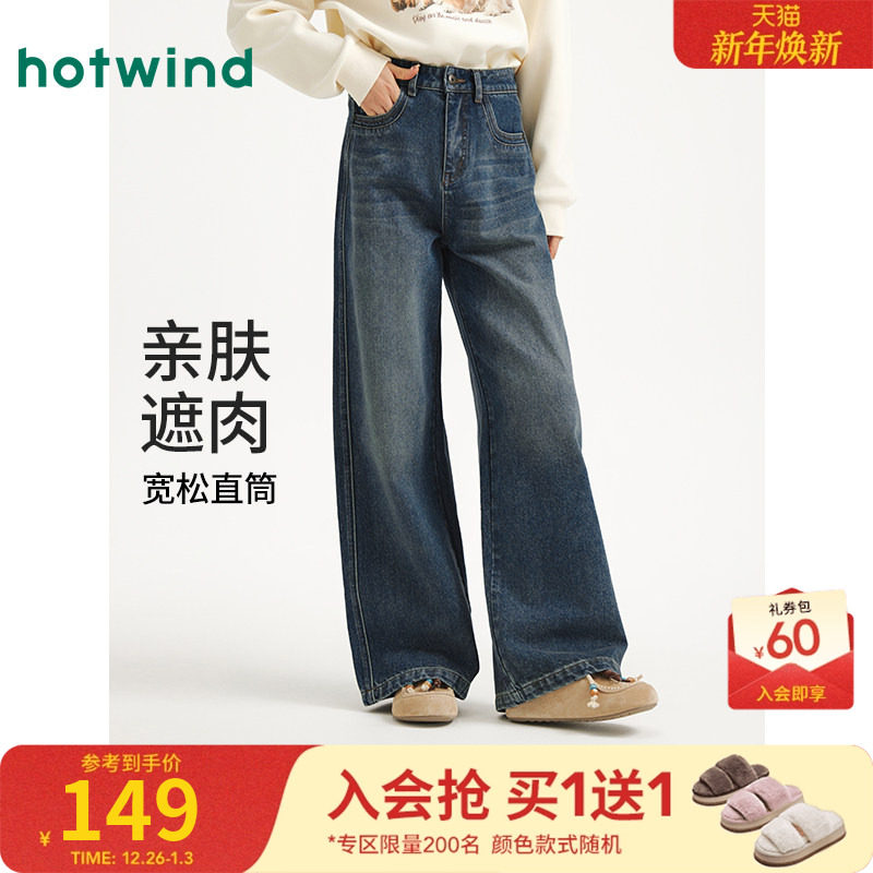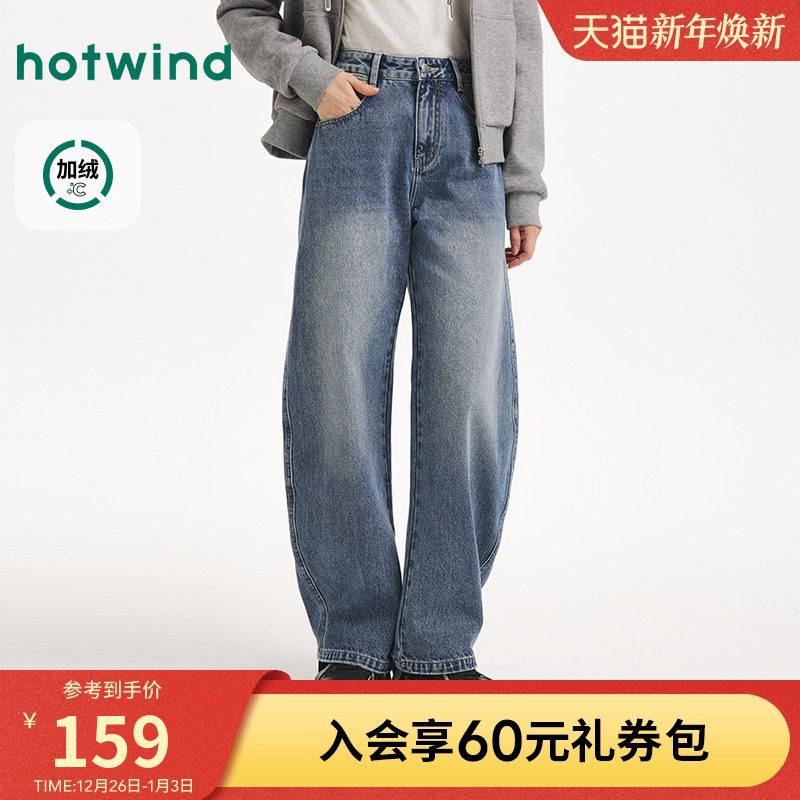 热风女士加绒牛仔裤2025年秋季新款简约复古宽松牛仔裤亲肤遮肉
