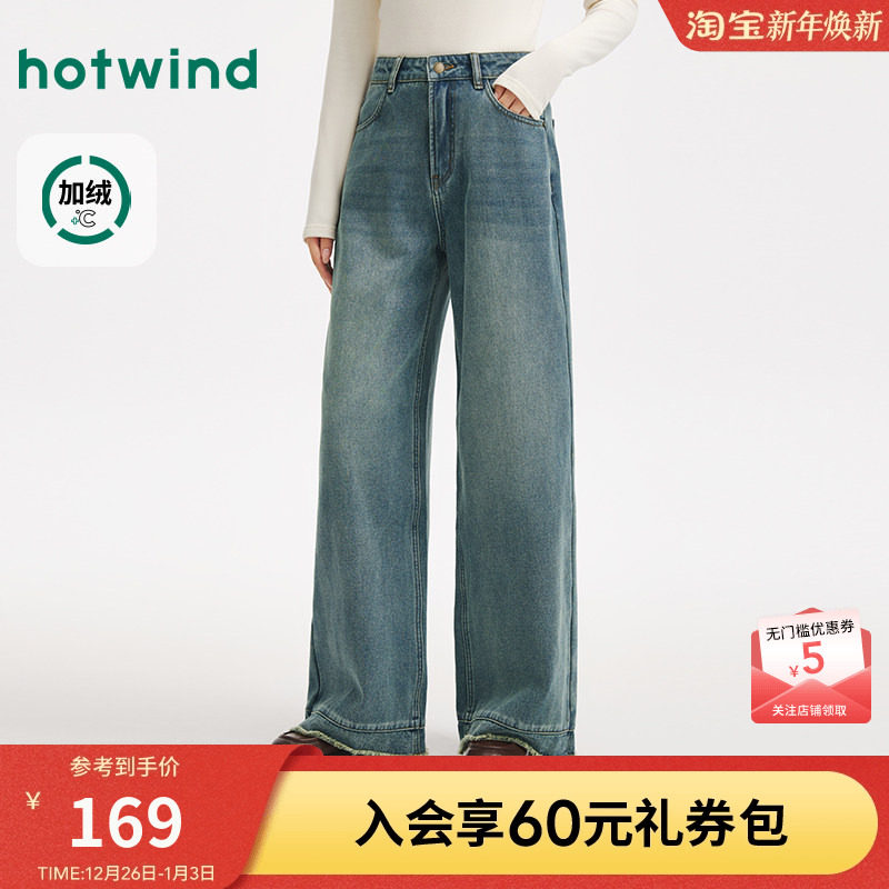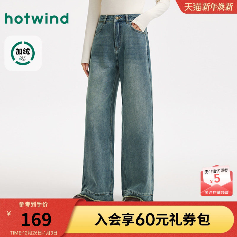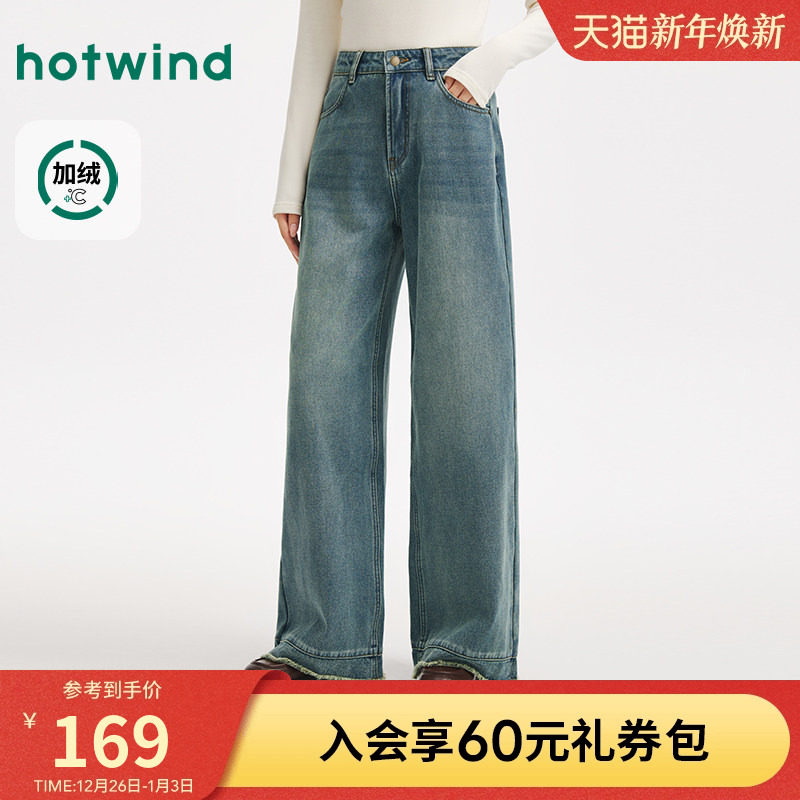 热风女士加绒牛仔裤2025年冬季新款磨毛绒感休闲阔腿显瘦牛仔裤