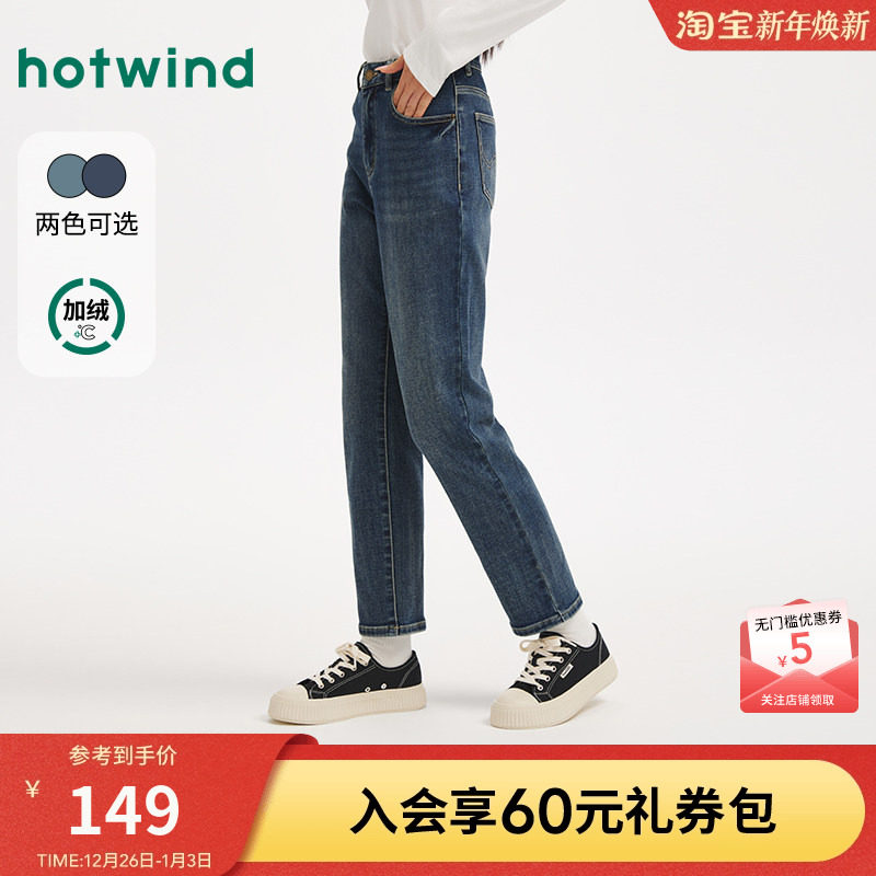 热风女士加绒牛仔裤2025年冬季新款时尚弯刀牛仔裤宽松窄脚长裤
