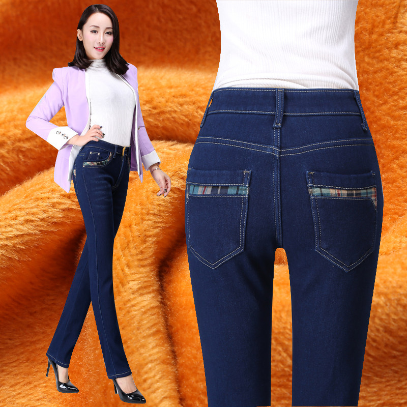 冬天女士加绒牛仔裤妈妈装弹力保暖长裤中老年大码女裤高腰直筒裤