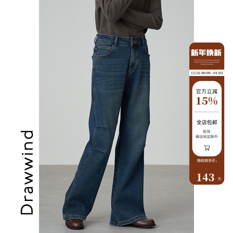 热风女士直筒加绒牛仔裤2025年秋季新款复古做旧阔腿显瘦牛仔裤