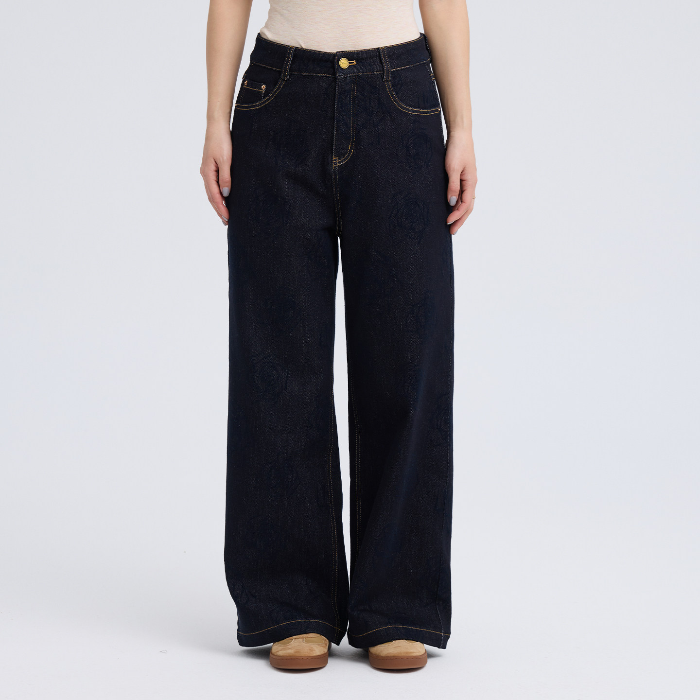 无色无味女士加绒牛仔裤新款复古玫瑰提花阔腿裤深蓝色系直筒裤子