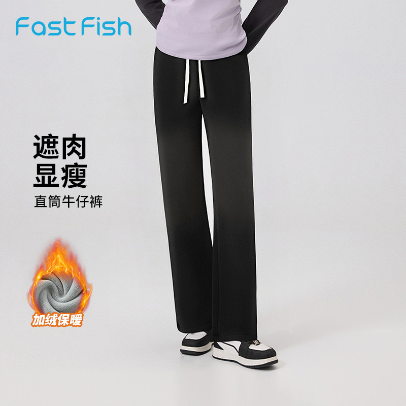 快鱼2025年冬季新款女士加绒牛仔裤牛仔布水洗阔腿裤美式风女裤