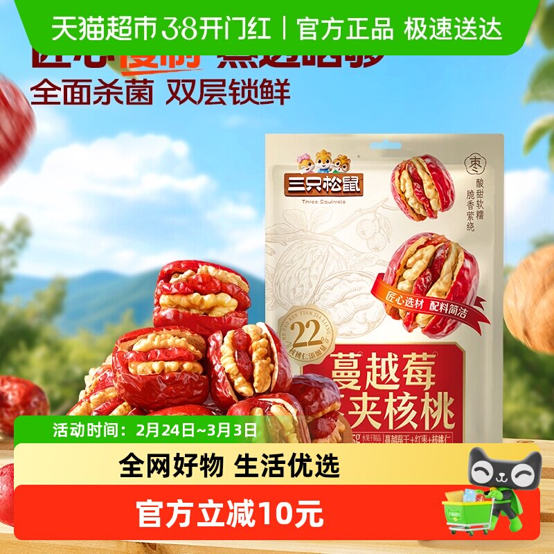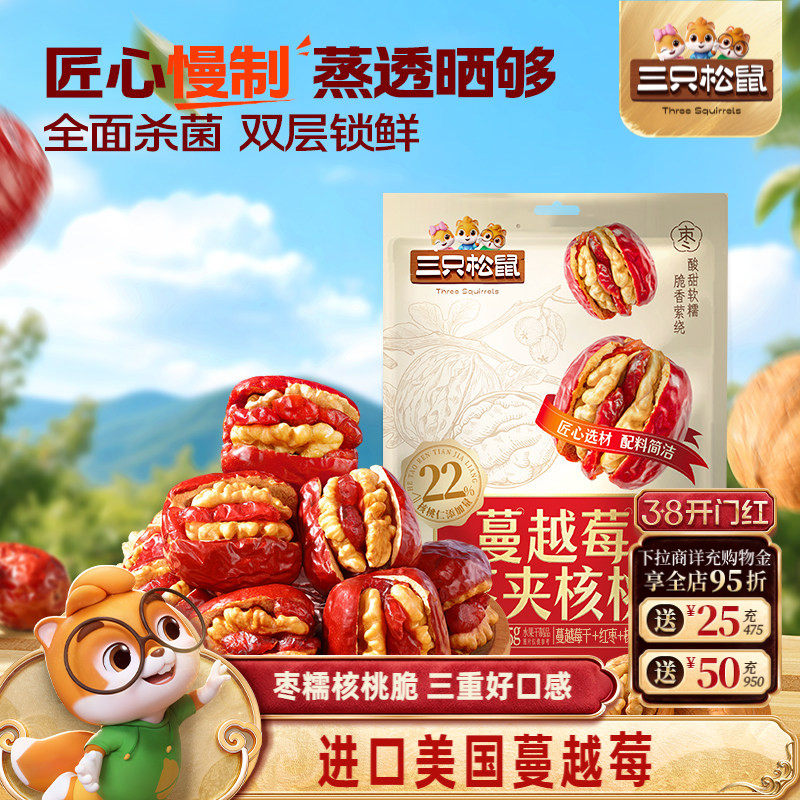 【三只松鼠_蔓越莓枣夹核桃】新疆去核红枣蒸晒果干零食解馋特产